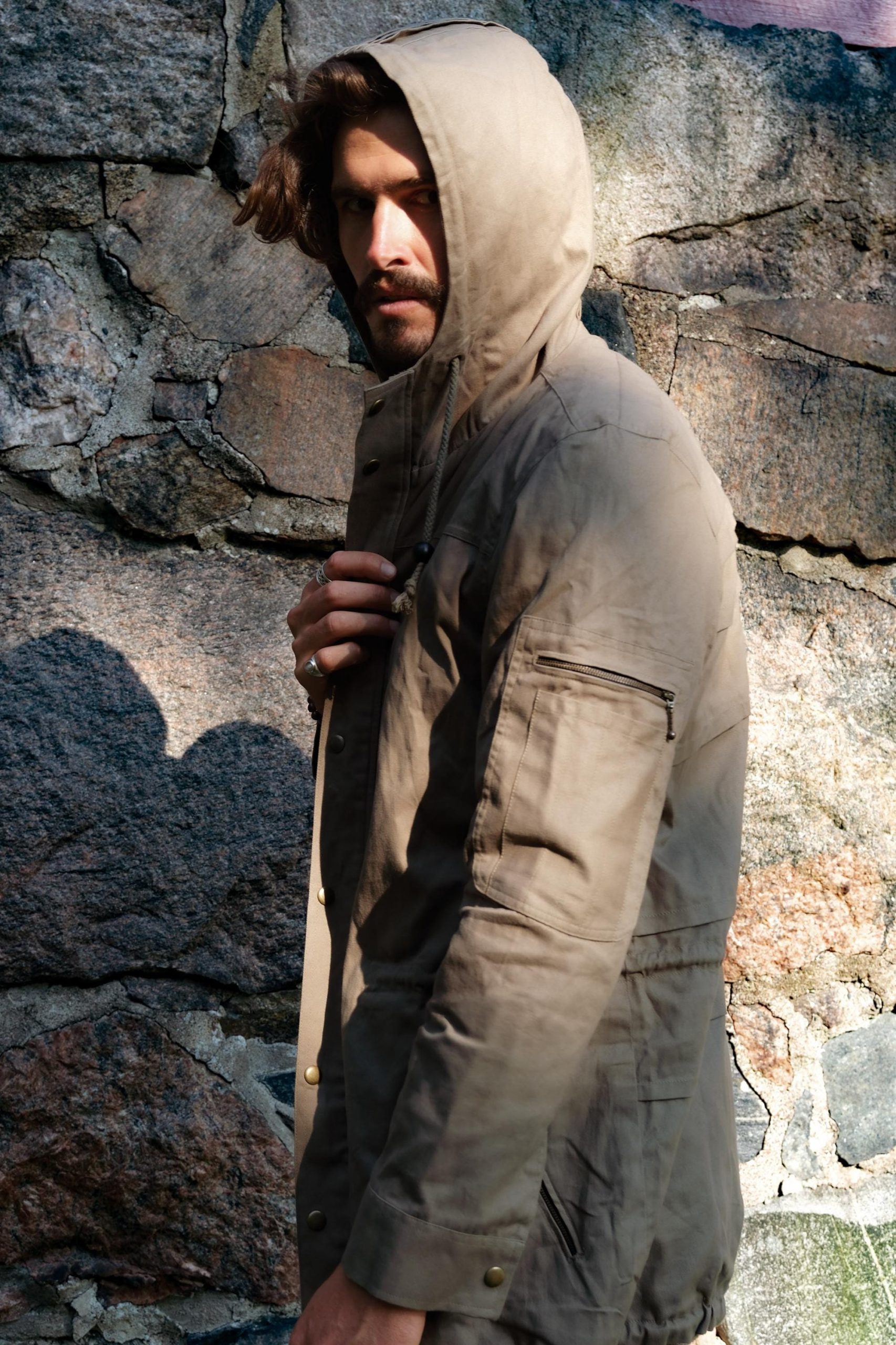 Tightening strings with stoppers on the bottom to shape it to an anorak style and feel – strings with stoppers also in the middle body (inside) and in the hood.
