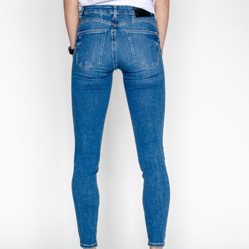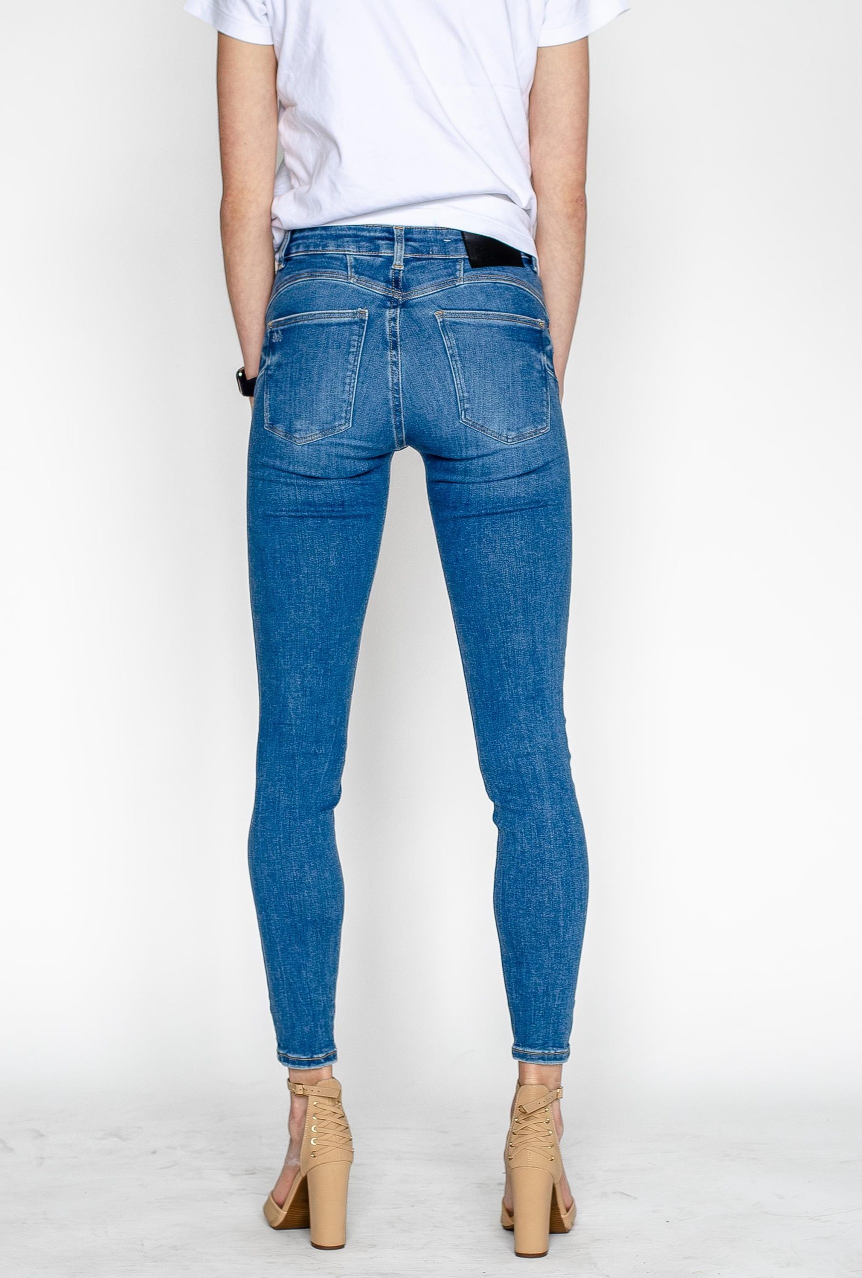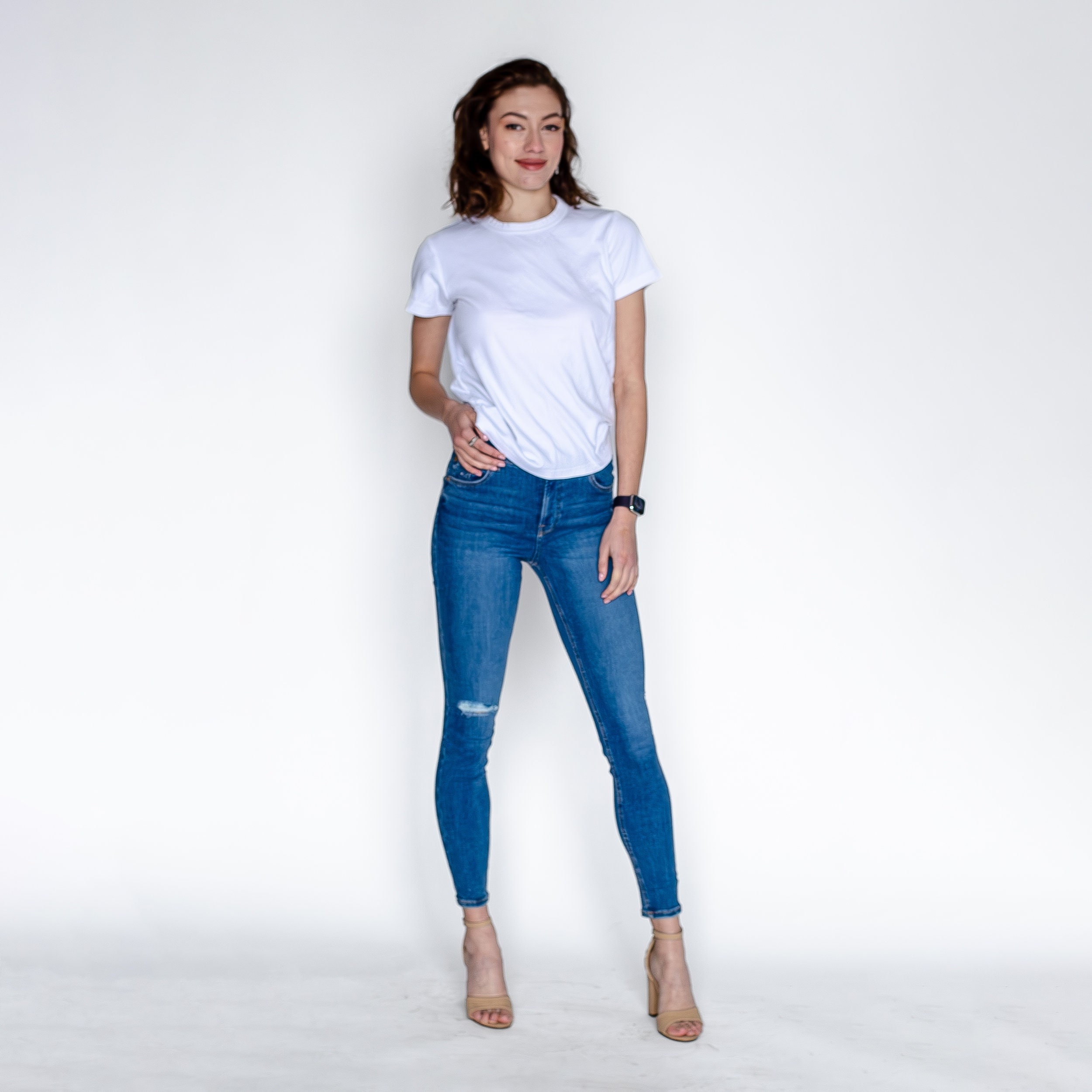 Add a touch of effortless cool to your look with these medium wash, high-waisted skinny jeans. Featuring a subtle distressed detail and a stylish ripped knee, these jeans are a perfect blend of edgy and classic. The soft, stretchy denim provides a flattering and comfortable fit that will make them your new go-to pair.