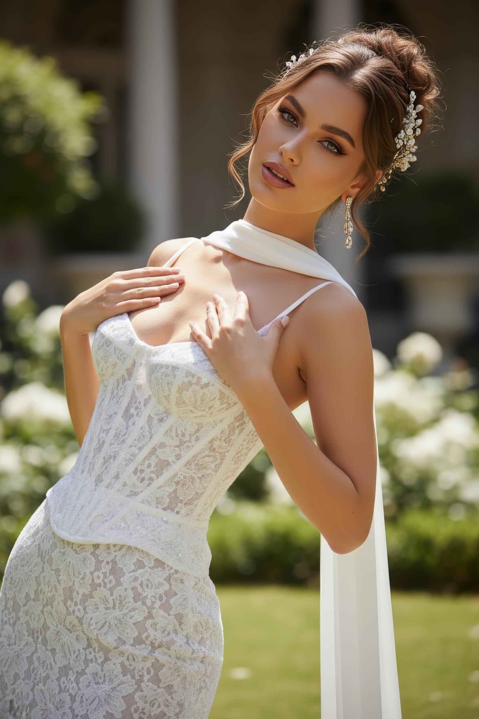 Turn every step into a moment with this lace corset mini wedding dress, blending delicate sensuality and timeless sophistication.