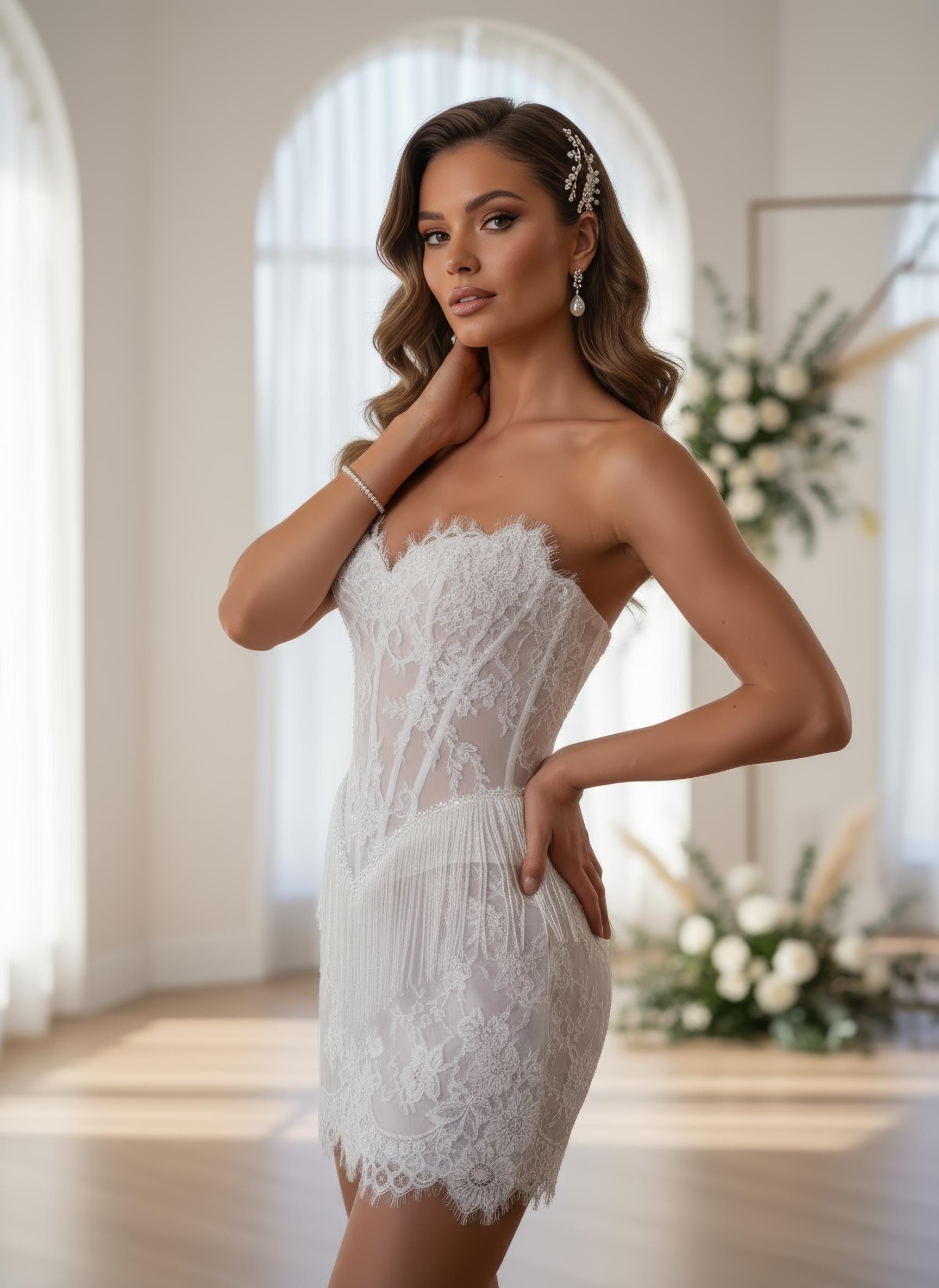 Step into pure elegance with this strapless lace fringe corset mini dress, designed to highlight your feminine silhouette with sophistication and glamour.